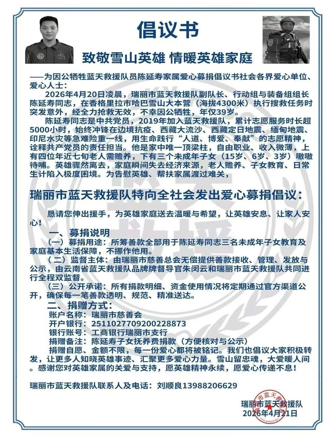 此外,封面新闻记者注意到,瑞丽市蓝天救援队也于当日,面向全社会发布一封倡议书。倡议书中提到,陈延寿上有四位年近七旬老人需赡养,下有三个未成年子女(15岁、6岁、3岁)需要扶育。他的离世,让家庭瞬间失去经济来源,老人赡养、子女教育、日常生计陷入极度困境。募捐说明显示,所筹善款全部用于陈延寿三名未成年子女教育及家庭基本生活保障,由瑞丽市慈善总会无偿提供善款接收、管理、发放与公示,由云南省蓝天救援队品牌牌督导官朱闵云和瑞丽市蓝天救援队共同进行全程双监督。
