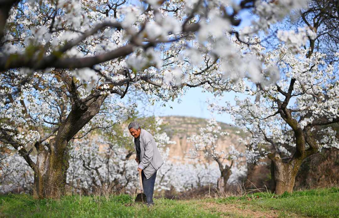 山西省隰县龙泉镇陈家河村梨园,果农正在开展春季管护工作。张瑞强摄